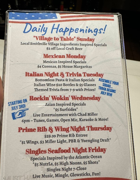 Our first time here. I worry sometimes about a place that could be an overpriced tourist trap. It was not overpriced and we had a great meal. My wife ordered a turkey sandwich which had enough turkey to feed the two of us. She also ordered a salad that was obviously very freshly chopped. I usually don't eat red meat, but I decided to treat myself to a burger. The patty was thick and perfectly cooked, it had ample shredded lettuce (I love shredded lettuce) and tomatoes, and it came on a brioche bun. A perfect burger. I avoided getting fries and went for the jasmine rice. Who the hell serves jasmine rice??? It was cooked perfect. Loved it. I also ordered one beer which was topped off to within one millimeter of the top of the glass. I was so stuffed from the food that my wife had to help me finish the beer (Yuengling). The vibe is great. Seating inside and out (we wanted the ac inside). The staff are wonderful. I highly recommend this place and we most likely will return here again.