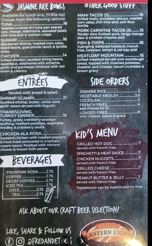 Fred and Ethel’s Lantern Light is open on Monday, Tuesday, Wednesday, Thursday, Friday, Saturday and Sunday from 11:30 AM - 9:00 PM.
